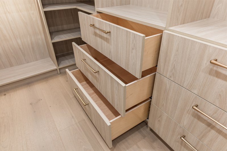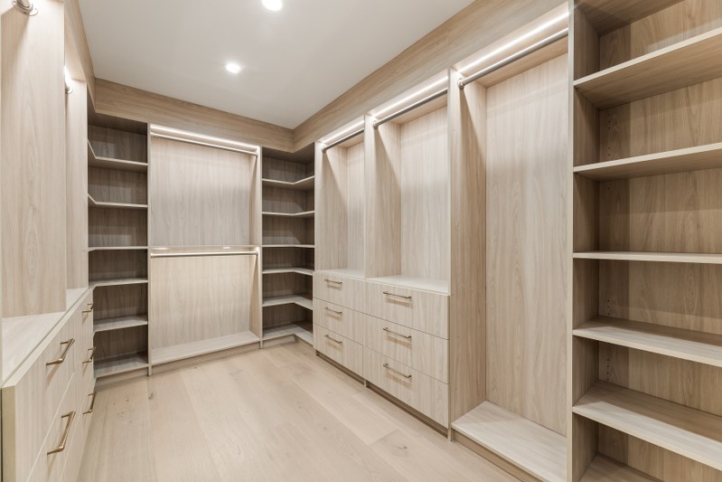 Interiors are crafted with durable birch plywood, and custom organizers are incorporated where selected for optimized storage. The master closet continues the elevated detailing with full-height, frameless construction built to the ceiling and LED lighting throughout, delivering a sleek, modern, and highly functional space.