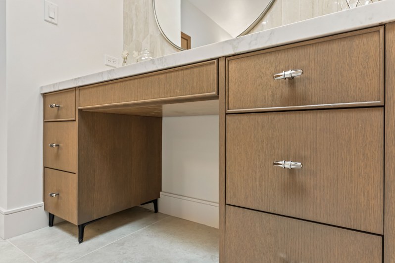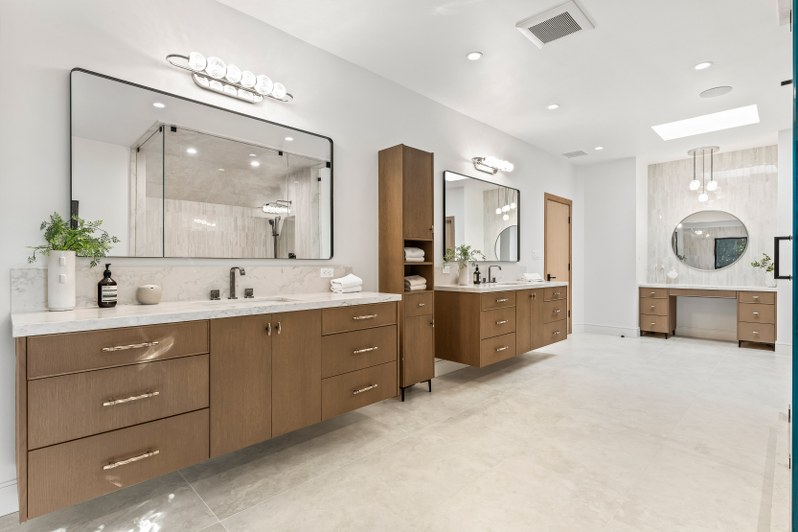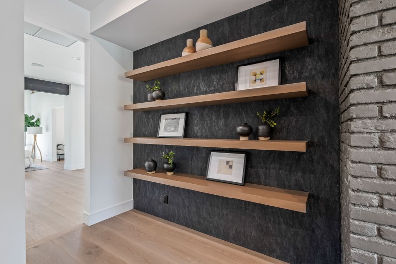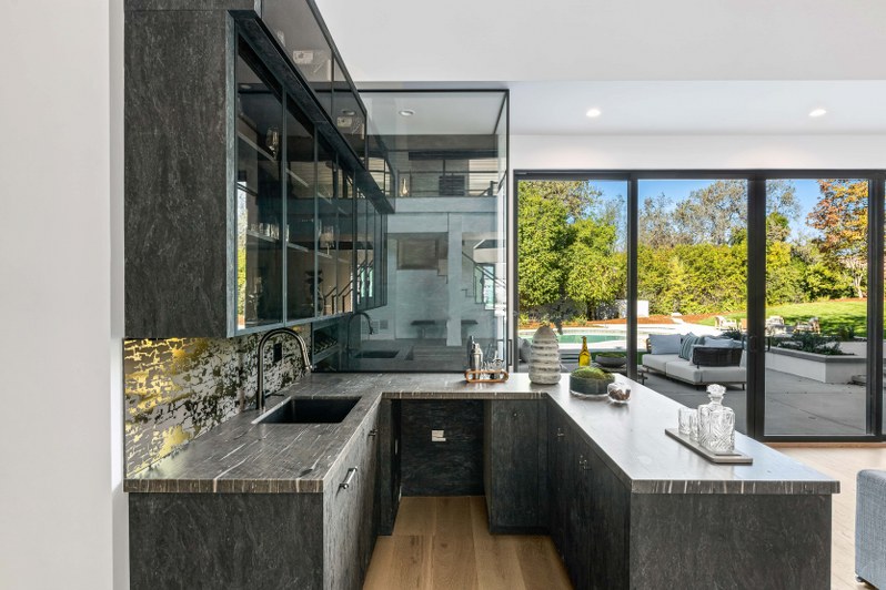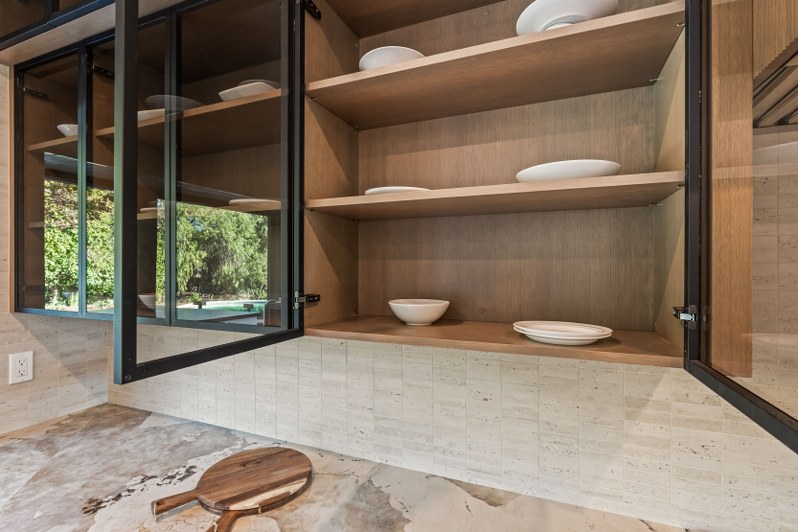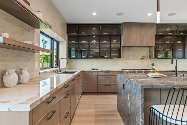 This home in the heart of Westlake Village features a beautifully crafted kitchen in rift white oak, highlighted by a refined 3/8″ bead detail along the perimeter of each door, complemented by a matching beaded accent on the hood. Integrated LED lighting is thoughtfully incorporated throughout, illuminating the space beneath the wall cabinets and floating shelving. The back wall is enhanced with glass-front upper cabinetry, adding depth and a light, airy feel to the design.
