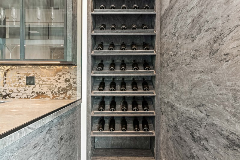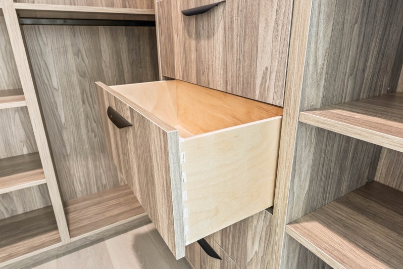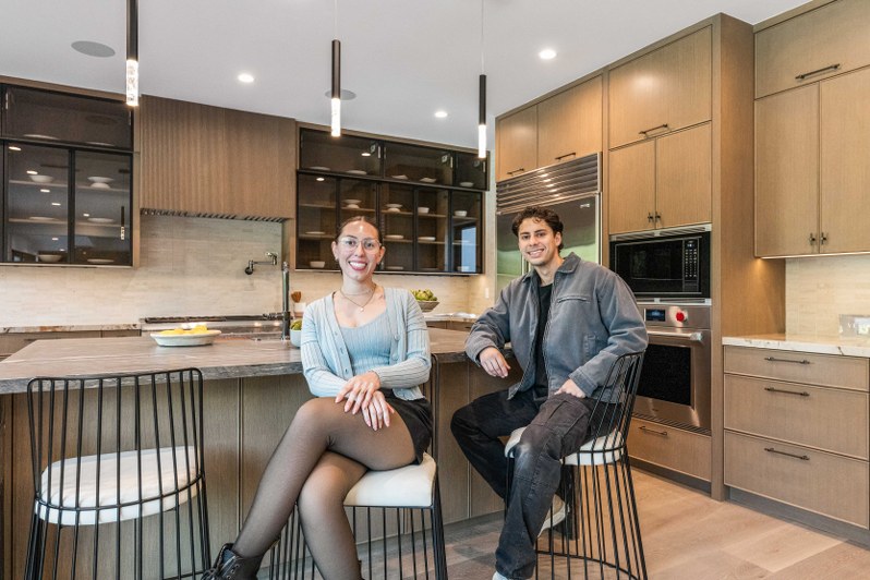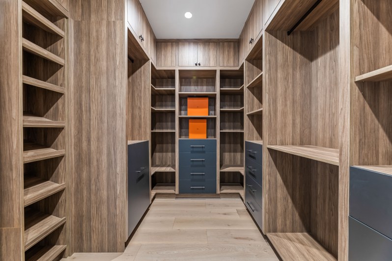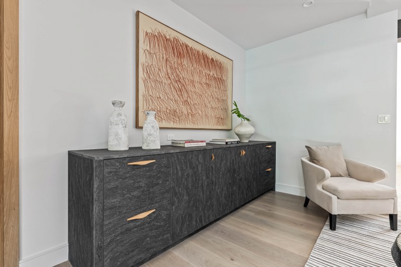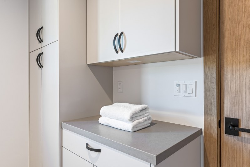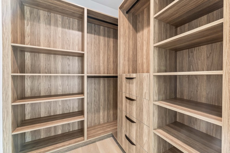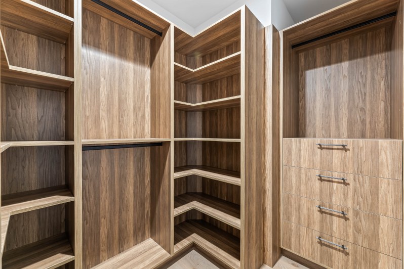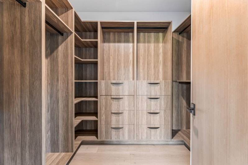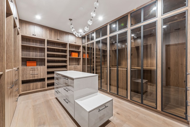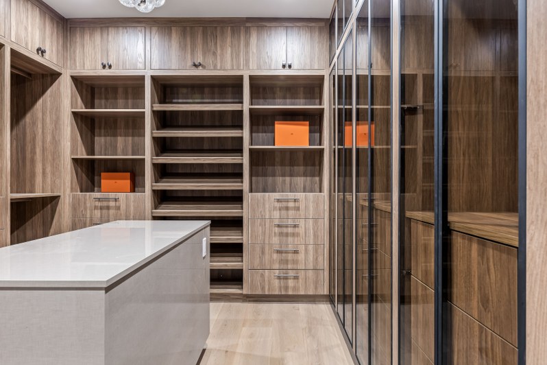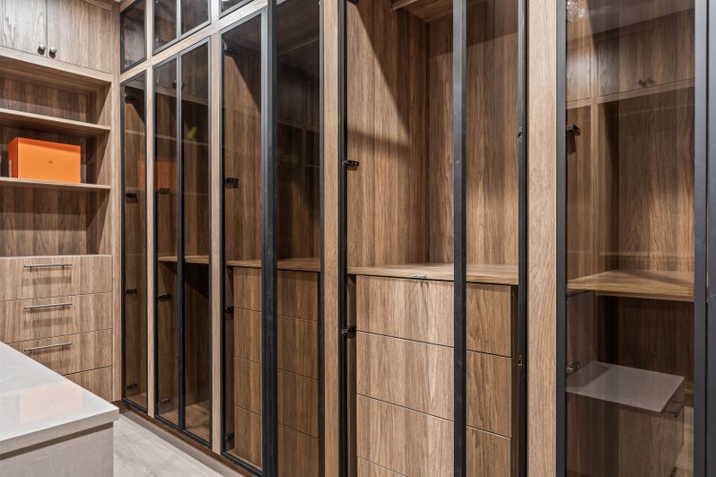 Upstairs, the bar, entertainment center, and linen closet are finished in a textured black laminate, offering a bold contrast to the warmth of the wood tones. All closets are designed as walk-ins and completed in a wood-textured laminate, combining functionality with a clean, modern look.